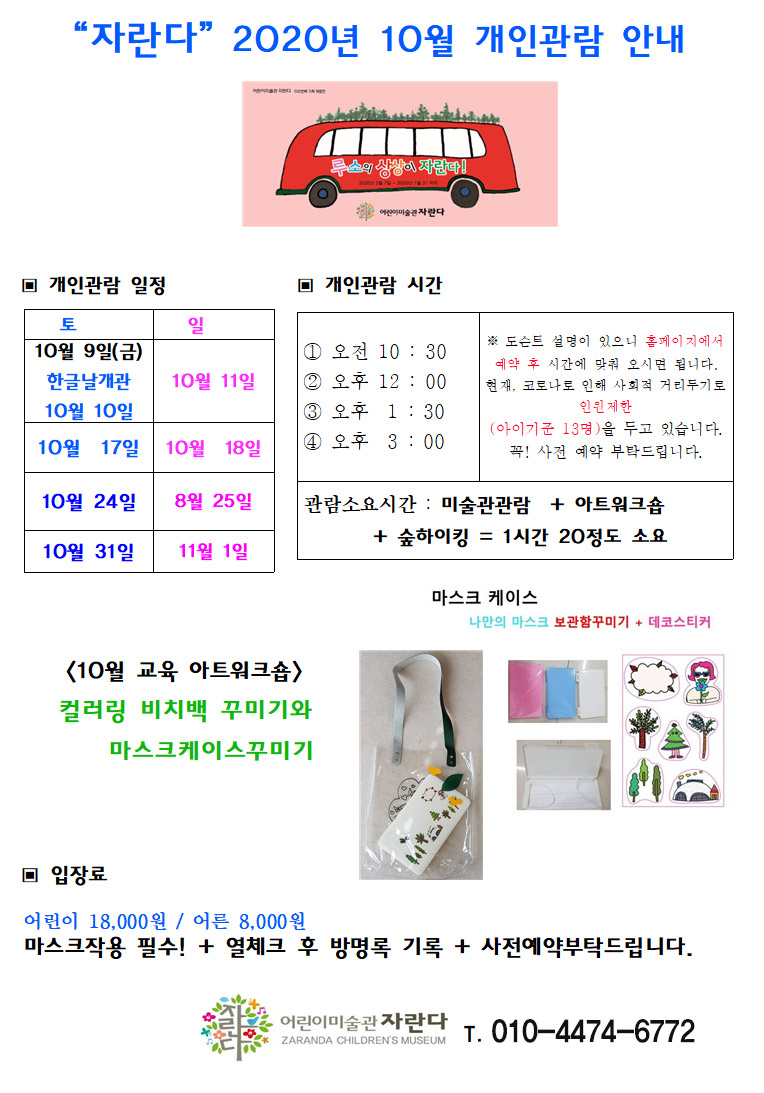 전시일정 | 10월 개인관람 안내 페이지 정보 작성자 자란다 작성일20-09-24 01:32 조회11,957회 댓글0건 관련링크 이전글 다음글 목록 본문 풍요로운 추석 잘 보내시기 바랍니다.2020년 10월9일부터 예약접수 시작.10월 주말 개인관란시작합니다. 댓글 등록된 댓글이 없습니다. 이전글 다음글 목록