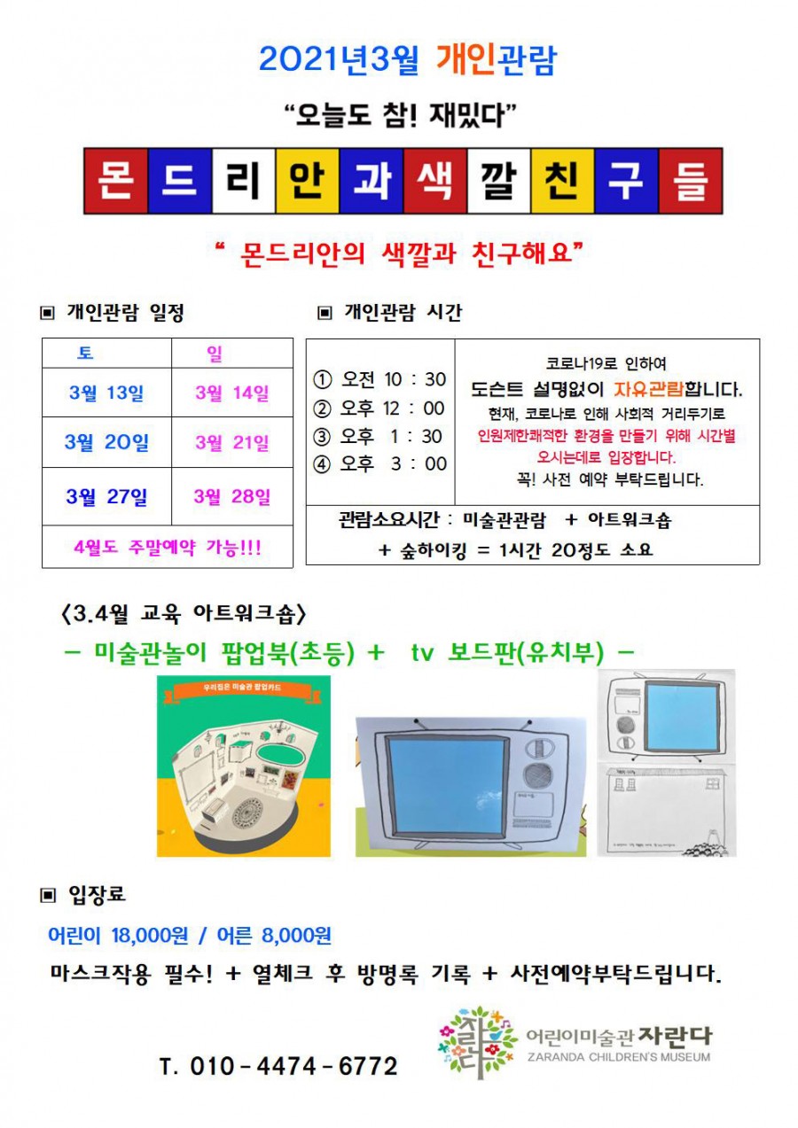 전시일정 | 자란다 여섯번째 전시, 개인관람 안내 페이지 정보 작성자 자란다 작성일21-02-25 15:48 조회10,536회 댓글0건 관련링크 이전글 다음글 목록 본문 이외 자세한 내용은 전화로 문의하시기 바랍니다. 댓글 등록된 댓글이 없습니다. 이전글 다음글 목록