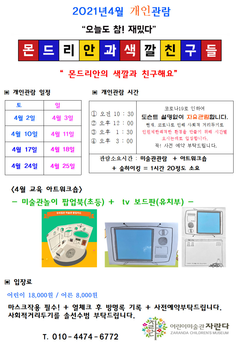 전시일정 | 4월 개인관람 안내 페이지 정보 작성자 자란다 작성일21-03-29 18:12 조회10,892회 댓글0건 관련링크 이전글 다음글 목록 본문 많은 관심 부탁드립니다. 댓글 등록된 댓글이 없습니다. 이전글 다음글 목록