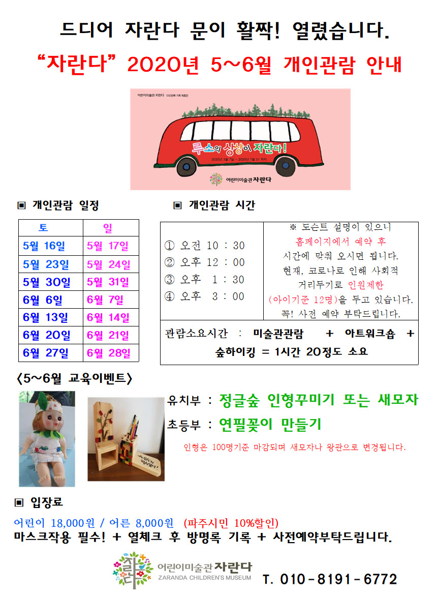 전시일정 | 2020년 5~6월 개인관람 안내 페이지 정보 작성자 자란다 작성일20-05-08 14:44 조회12,197회 댓글0건 관련링크 이전글 다음글 목록 본문 많은 관심 부탁드립니다. 댓글 등록된 댓글이 없습니다. 이전글 다음글 목록