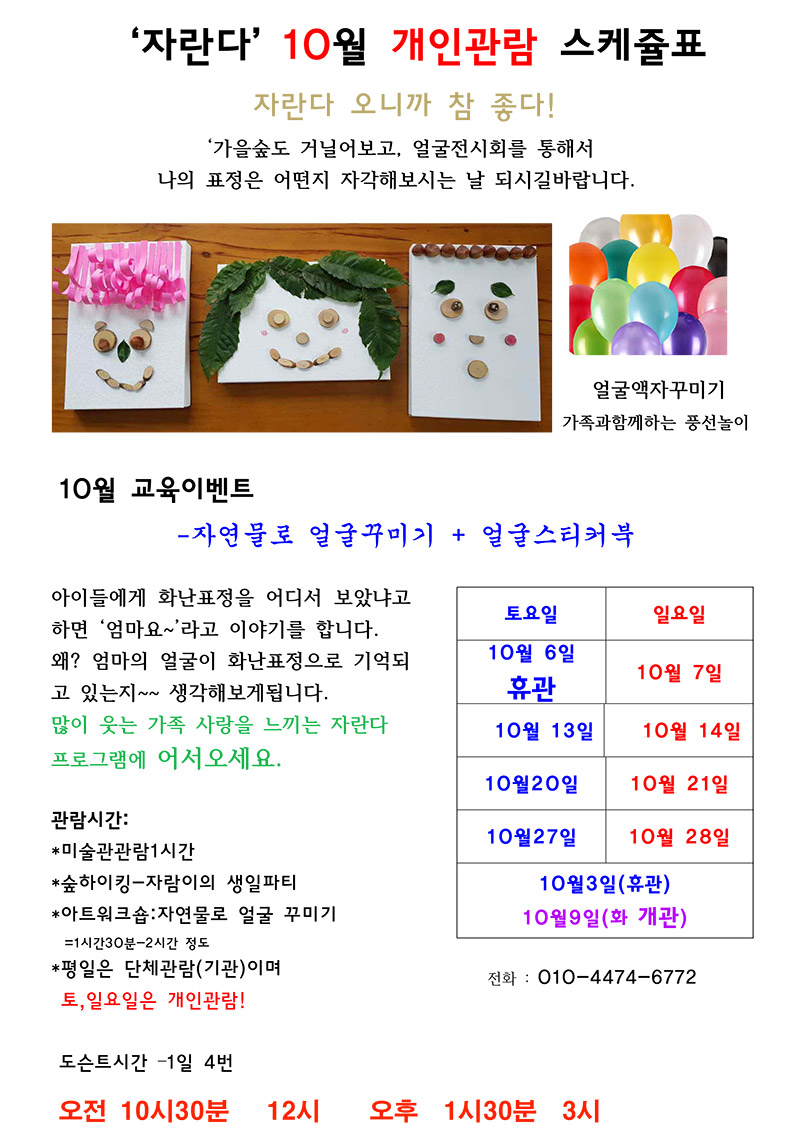 전시일정 | 10월 개인관람 안내 페이지 정보 작성자 자란다 작성일18-09-20 06:39 조회14,816회 댓글0건 관련링크 이전글 다음글 목록 본문 댓글 등록된 댓글이 없습니다. 이전글 다음글 목록