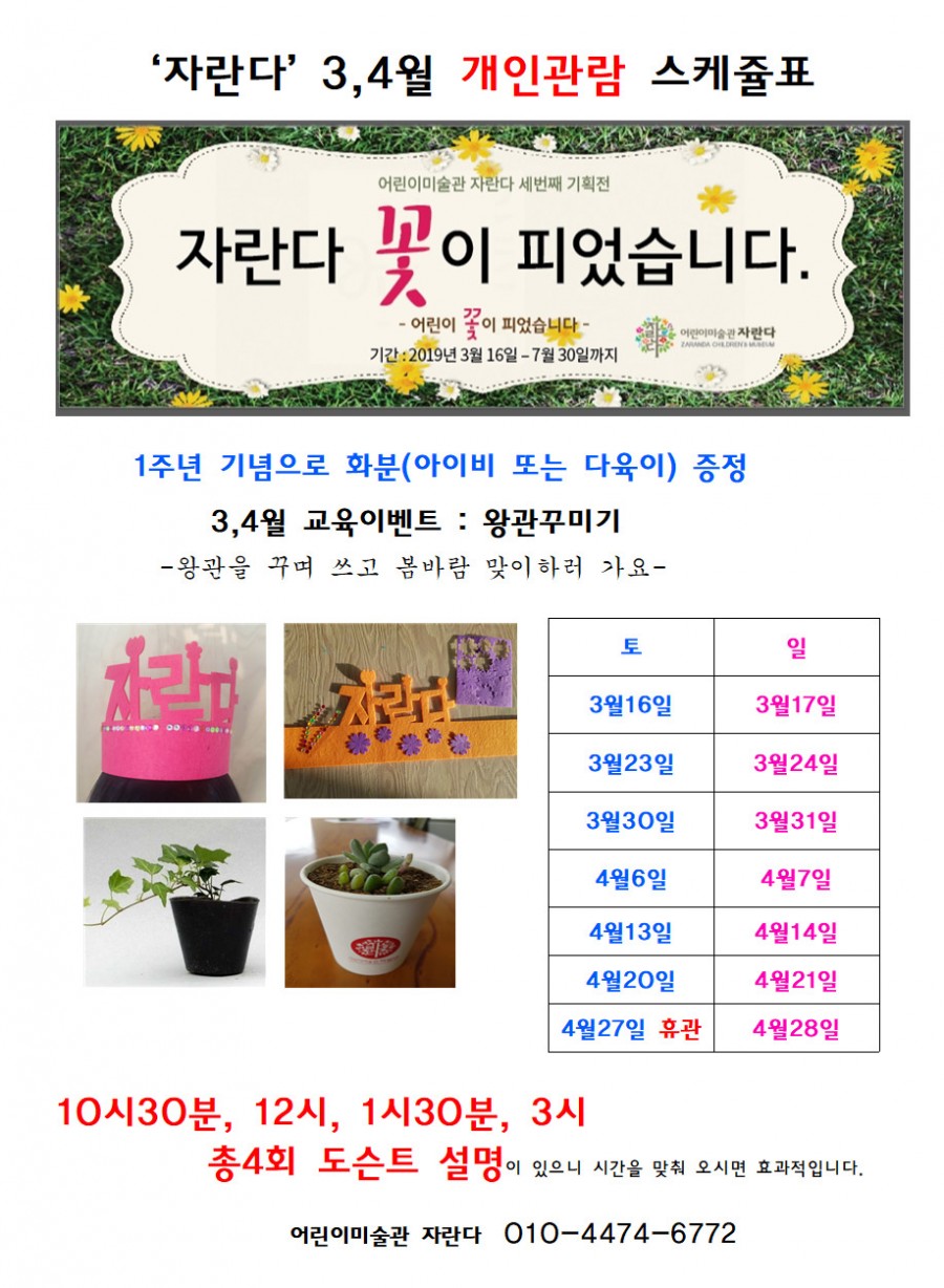 전시일정 | 3월 4월 개인관람 전시일정 안내 페이지 정보 작성자 자란다 작성일19-03-06 19:59 조회16,100회 댓글0건 관련링크 이전글 다음글 목록 본문 많은 참여 부탁드립니다! 댓글 등록된 댓글이 없습니다. 이전글 다음글 목록